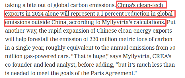 报道称,中国在清洁科技领域的投资推动了惊人的转型。目前,中国生产了全世界约三分之二的电动汽车、约六成的风机叶片以及超过85%的电池容量。根据国际能源署去年的预测,中国清洁能源技术出口有望在2035年达到年出口3400亿美元的规模,这一数字约相当于目前沙特和阿联酋石油出口的总和。